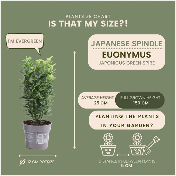 De Euonymus Green Spire groeit gemiddeld tot snel en vormt snel een dichte haag, waardoor privacy gecreëerd wordt. Hij kan een hoogte bereiken van ongeveer 2 tot 3 meter wanneer volgroeid. Het glanzende groene blad van de Euonymus Green Spire zorgt voor een mooie achtergrond in de tuin en behoudt zijn bladeren gedurende het hele jaar.