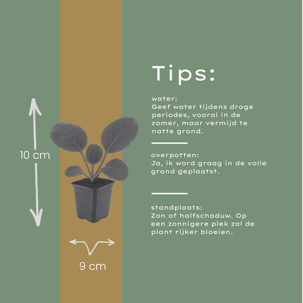 De Bergenia cordifolia, ook wel bekend als schoenlappersplant, is een sterke en wintergroene vaste plant die het hele jaar door structuur en kleur in de tuin brengt. Met haar grote, glanzende bladeren en prachtige roze tot paarsroze bloemstengels in het vroege voorjaar is deze plant een echte sfeermaker in borders, schaduwrijke plekken of als bodembedekker. Bergenia cordifolia is zeer onderhoudsarm, verdraagt droogte goed en blijft zelfs in de winter aantrekkelijk dankzij het decoratieve blad, dat soms verkleurt naar warme roodtinten. Een ideale keuze voor tuinders die op zoek zijn naar een betrouwbare, stijlvolle en veelzijdige plant.