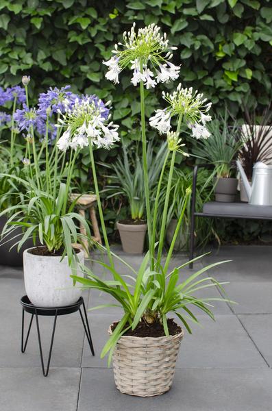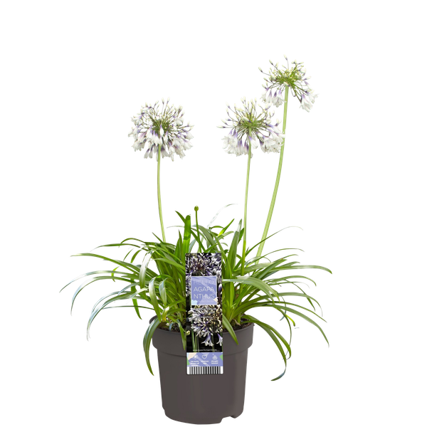 De Agapanthus Fireworks is de eerste herbloeiende, groenblijvende, tweekleurige Agapanthus ter wereld! De plant is winterhard tot -10 ºC gebleken, wat meer winterhard is dan andere groenblijvende en tweekleurige Agapanthus soorten. Hij heeft een kort, breed groen blad die een groot contrast vormt met de bloemen. Deze grote paars-witte schermbloemen hebben meerdere trompetvormige bloemen die hoog op een steel staan.