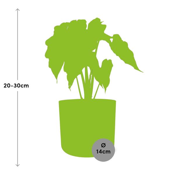 Alocasia, ook bekend als Olifantsoor, gedijt het best op een plek met gedeeltelijke schaduw en moet eens per week water krijgen. Het geeft de voorkeur aan goed doorlatende grond die rijk is aan organisch materiaal. Voor optimale groei, bemest de plant elke 2-4 weken tijdens het groeiseizoen met een gebalanceerde vloeibare meststof. Aangezien de plant in een siervaas wordt geleverd, zorg ervoor dat deze voldoende drainagegaten heeft om wateroverlast te voorkomen. Met de juiste verzorging zal deze prachtige plant een vleugje tropische schoonheid toevoegen aan elke ruimte.