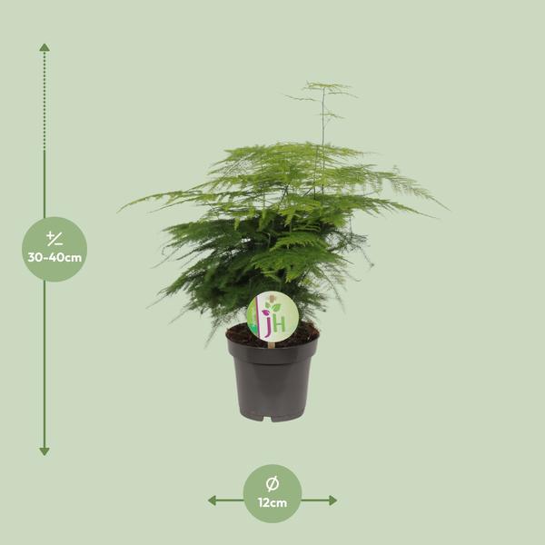 Met zijn fijne, gevederde bladeren en klimmende groei, voegt de Asparagus plumosus een elegante touch toe aan elk interieur. De potmaat van 12 cm biedt voldoende ruimte voor de plant om zich te ontwikkelen en een hoogte van 35 cm te bereiken, waardoor het een geschikte keuze is voor kleinere ruimtes of als onderdeel van een plantenarrangement.
