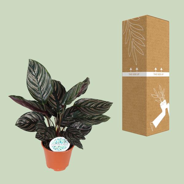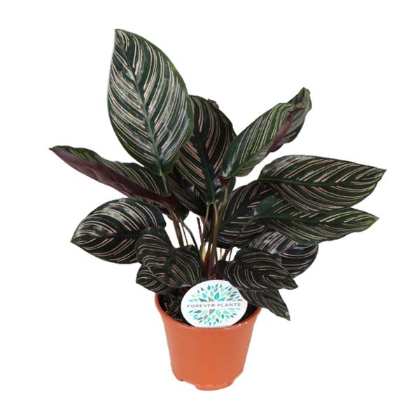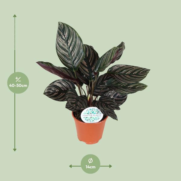 Ontdek de betoverende Calathea Ornata, een fascinerende kamerplant die een vleugje elegantie toevoegt aan elke ruimte. Ook bekend als de Calathea, komt deze botanische wonder uit de tropische regio’s en straalt een rustgevende sfeer uit. Haar weelderige, fluweelachtige bladeren, versierd met opvallende witte markeringen, creëren een opvallende presentatie. Met haar luchtzuiverende eigenschappen en lage onderhoudseisen is deze prachtige plant perfect voor zowel ervaren plantenliefhebbers als beginners. Breng de Calathea majestica Whitestar mee naar huis en transformeer je ruimte in een oase van sereniteit. De Calathea Ornata, een prachtige toevoeging aan elke ruimte, gedijt het beste op een plek waar halfschaduw is. Deze schoonheid houdt van gefilterd licht, waardoor het perfect is voor heldere, indirecte lichtgebieden. Om optimale groei te garanderen, moet deze plant regelmatig water krijgen, waarbij de grond vochtig maar niet drassig moet blijven. Met zijn prachtige bonte bladeren is deze Calathea een echte blikvanger. Omarm de elegantie van de Calathea majestica Whitestar terwijl je je leef- of kantoorruimte verbetert. Haal de jouwe vandaag nog en ervaar de betoverende schoonheid van deze prachtige plant!Wist je dat Calathea Ornata, ook bekend als de “Koningin van Calathea,” prachtig levendige bladeren vertoont met contrasterende patronen die op handgeschilderde streken lijken? Deze tropische schoonheid, afkomstig uit Zuid-Amerika, is een populaire keuze voor binnenhuisdecoratie vanwege haar vermogen om te gedijen in omstandigheden met weinig licht. Het is echter belangrijk om op te merken dat deze plant strikt decoratief is en niet eetbaar. Dus, hoewel je niet kunt genieten van haar bladeren in een salade, kun je nog steeds genieten van het plezier dat een vorstelijke en visueel betoverende plant je woonruimte opfleurt!- Calathea Ornata heeft een potmaat van 14 cm, waardoor het perfect is voor kleinere ruimtes of als een decoratieve toevoeging aan uw binnen tuin.- Met een hoogte van ongeveer 45 cm voegt deze Calathea variëteit een elegante touch toe aan elke kamer met zijn hoge, levendige bladeren.- Calathea is een veelvoorkomende naam voor deze plant, die behoort tot de Marantaceae familie en bekend staat om zijn betoverende bladpatronen.- Deze specifieke Calathea variëteit, net als veel andere, gedijt op een plek met gedeeltelijke schaduw, waardoor het een ideale keuze is voor degenen die op zoek zijn naar een kamerplant die het goed doet bij weinig licht.- Leuk feitje: Calathea bladeren veranderen vaak van positie gedurende de dag, als reactie op het zonlicht en passen hun positie aan om maximale opname te bereiken.