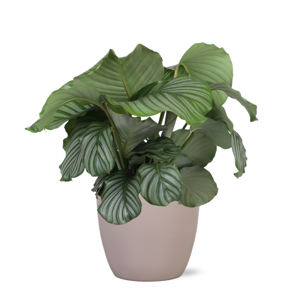 Stap in de betoverende wereld van de Calathea Orbifolia, waar elegantie en exotische schoonheid samenkomen! Met haar opvallende zilverachtige bladeren, bedrukt met fijne groene strepen, is deze kamerplant een meesterwerk van de natuur dat een vleugje tropische pracht naar jouw huis brengt. De Calathea Orbifolia staat niet alleen bekend om haar visuele verfijning, maar ook om haar unieke eigenschap om ‘s nachts haar bladeren op te rollen, wat een bijzonder schouwspel creëert.