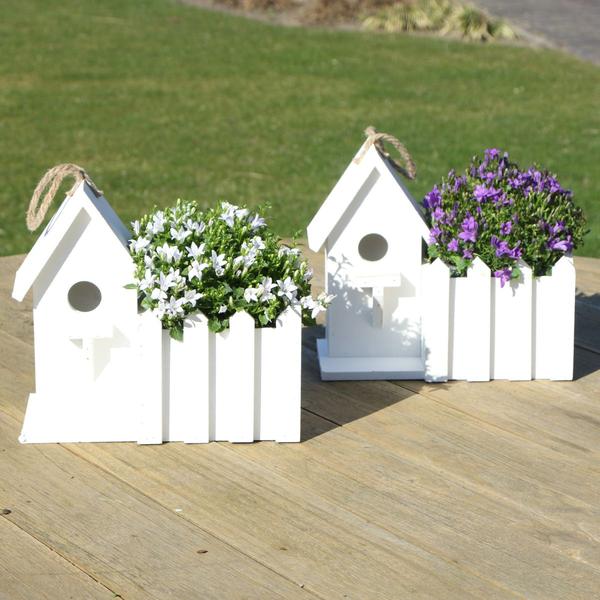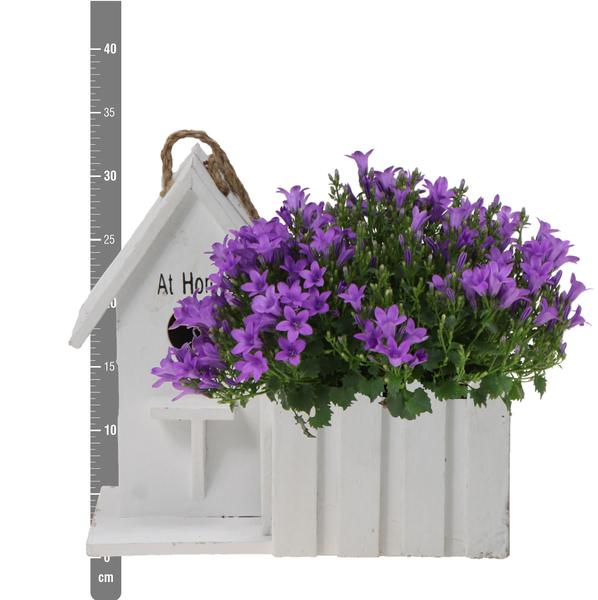 Dit prachtige vogelhuisje trekt de aandacht. Het houten vogelhuisje heeft plek voor een prachtige paarse Campanula. Door de toevoeging van een Campanula ziet het vogelhuisje er direct heel fraai en uniek uit. Met hun klassieke dan wel vrolijke uitstraling zijn de Addenda Campanula’s misschien wel de meest dankbare planten die je kunt bedenken. De uitbundige bloemenpracht van de Addenda Campanula maakt van het vogelhuisje een echte eyecatcher. Je kunt hem leuk op de eettafel in de achtertuin plaatsen of wat dacht je van ophangen aan de schutting. Met deze combinatie maak jij je achtertuin lente klaar. Het vogelhuisje is 25 centimeter hoog, en heeft een potmaat van 12 centimeter.