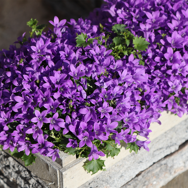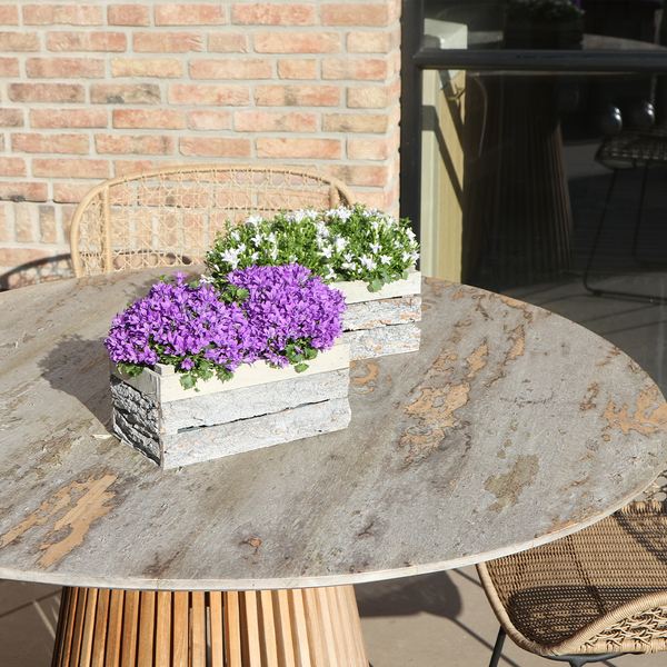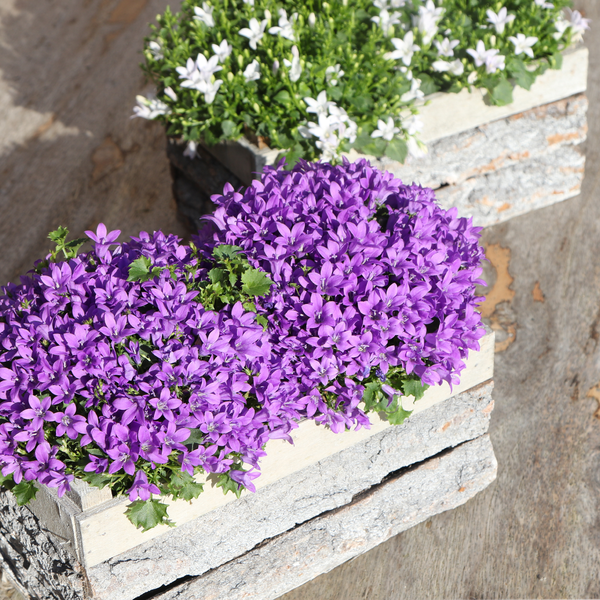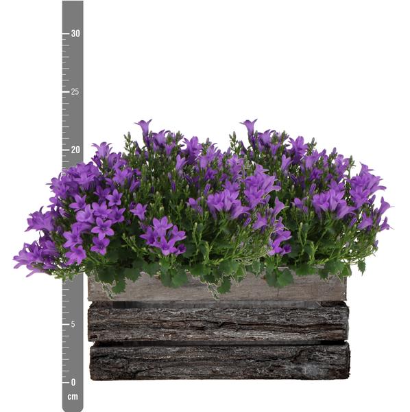 Hoe gaaf is deze natuurlijke houten kist in combinatie met deze 2 paarse Addenda Campanula’s. De houten kist brengt je helemaal terug de natuur in en heeft een robuuste uitstraling. Door het ruwe hout van de kist krijgt de campanula een stoer en natuurlijk uiterlijk. De uitbundige bloemenpracht van de Addenda Campanula vormt een stralend middelpunt in je tuin. Met hun klassieke dan wel vrolijke uitstraling zijn de Addenda Campanula’s misschien wel de meest dankbare planten die je kunt bedenken. De 2 paarse Campanula’s hebben beide een potmaat van 12cm. De houten kist heeft hierdoor een breedte van 24 centimeter.