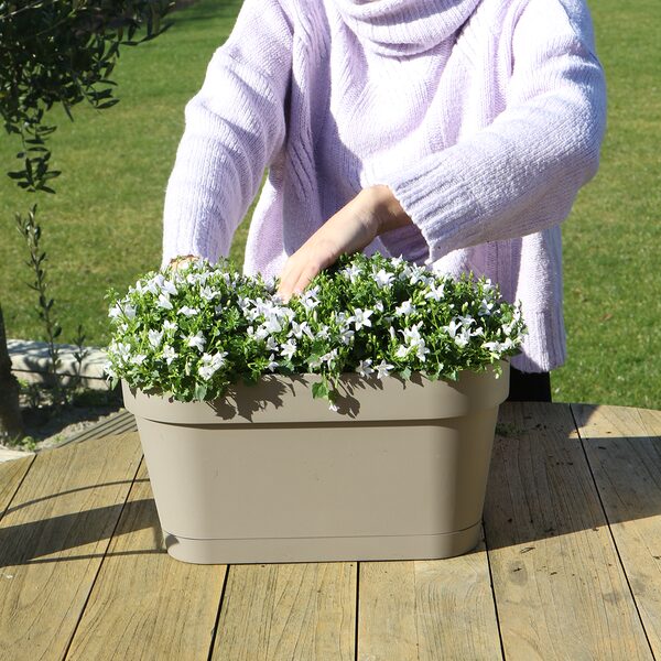 Met deze taupe kleurige balkonbak gevuld met 3 paarse Addenda Campanula’s, zorg je er voor dat jouw balkon of schutting er stralend uitziet. De taupe kleurige balkonbak, in combinatie met de witte Campanula’s, is een sierlijke aanvulling van jouw balkon of schutting. Met hun klassieke dan wel vrolijke uitstraling zijn de Addenda Campanula’s misschien wel de meest dankbare planten die je kunt bedenken. De balkonbak is voorzijn van een waterreservoir, hier wordt het water in opgevangen zodat de bak niet lekt. De bak heeft een handig systeem dat er voor zorgt dat hij stak en netjes bevestigd kan worden, zo hangt de balkonbak op elk balkon met de juiste afstand. De balkonbak past op een railing met een breedte tot 6 cm. De 3 bijbehorende witte Addenda Campanula’s hebben een potmaat van 12cm, hiermee is de balkonbak gevuld. De balkonbak heeft een breedte van 36cm en wordt compleet geleverd met de juiste hoeveelheid potgrond. Alleen nog even oppotten en jij kunt genieten van deze complete balkonbak.