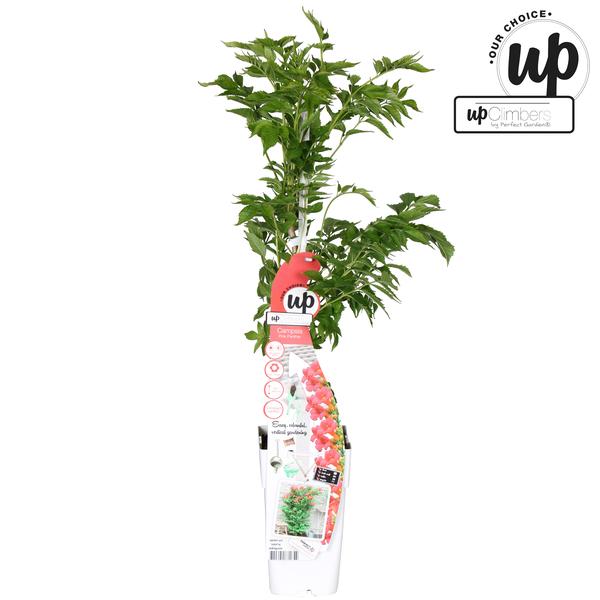 - De Campsis ‘Pink Panther’ is een klimplant met opvallende, trompetvormige bloemen in een zachte roze tint met een lichtgele keel.