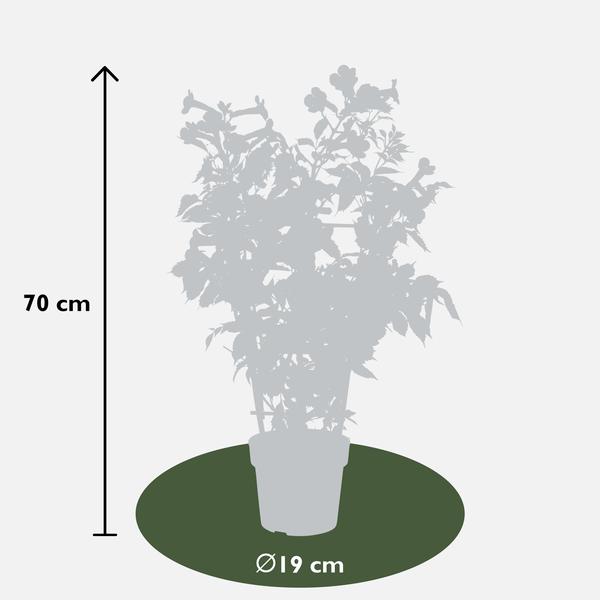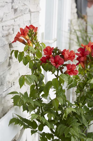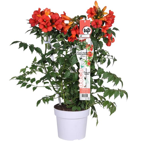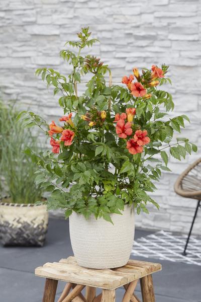 ‘Campsis Summer Jazz Fire Trumpet” is een winterharde trompetklimmer welke uitbundig en langer door bloeit bij veel zon. De rood bloemige Campsis groeit compacter dan andere soorten uit de Summer Jazz-serie, namelijk maximaal 3 meter hoog. De late zomer bloeier heeft de neiging om zich naar een struik te vormen. Wanneer je de Campsis wilt laten klimmen is het handig om het te ondersteunen met bijvoorbeeld een klimrek aan het begin van de groei. Deze Campsis is een zelfhechtende klimplant wat betekent dat er kleine hechtworteltjes vanuit de takken worden gevormd. Deze hechtworteltjes zullen zich langs de muur of schutting hechten.
