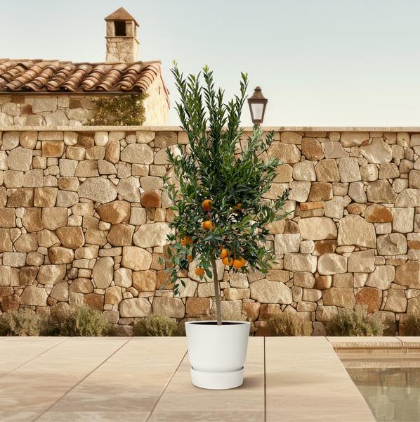 • De boom kan kleine, geurige witte bloemen dragen die zich ontwikkelen tot de kenmerkende, oranje Calamondin-citroenen.