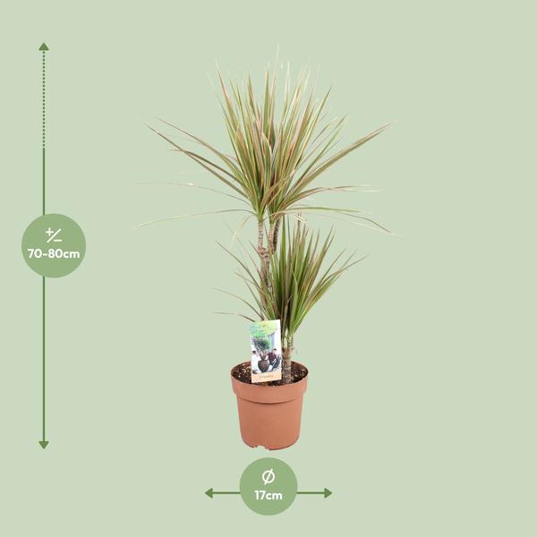 Geleverd in een handig formaat van 17 cm, perfect voor elke binnenruimteDe Dragontree is momenteel indrukwekkend 80 cm hoogGroeit goed in een halfschaduwrijke omgeving, waardoor het een geweldige toevoeging is aan elke kamer met voldoende natuurlijk lichtHet verzorgen van de Dragontree is een eitje, zelfs voor beginnersZijn prachtige verschijning, met levendige groene bladeren en unieke architecturale vorm, voegt een elegante toets toe aan elk interieur
