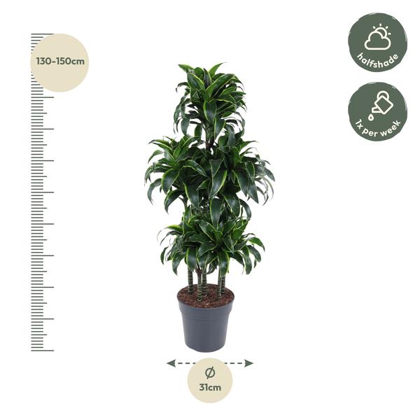 - De Dracaena Dorado heeft lange, smalle bladeren met een opvallende combinatie van groene en gouden tinten.