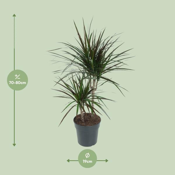 Introducing the Dracaena Magenta, ook wel bekend als de Dragontree, een prachtige kamerplant die een vleugje elegantie toevoegt aan elke ruimte. Oorspronkelijk afkomstig uit tropisch Afrika, gedijt deze kamerplant goed in omstandigheden met weinig licht, waardoor het perfect is om je huis of kantoor op te fleuren. Met zijn opvallende magenta bladeren en rechtopstaande groei zal de Dracaena Magenta zeker de aandacht trekken. Makkelijk in onderhoud en sterk, deze kamerplant zuivert de lucht en creëert een serene sfeer. Transformeer je omgeving met de betoverende Dracaena Magenta, de Dragontree die rust en schoonheid binnenshuis brengt. Dracaena, ook bekend als de Drakenboom, gedijt op een plek met halfschaduw en heeft eens per week water nodig. Het geeft de voorkeur aan goed doorlatende grond verrijkt met organisch materiaal. Om de groei te bevorderen, moet de plant elke 2-3 maanden tijdens het groeiseizoen worden bemest met een uitgebalanceerde vloeibare meststof. Vermijd echter overbemesting, omdat dit kan leiden tot bladverbranding of wortelschade. Het in gedachten houden van deze verzorgingstips zorgt voor een gezonde en levendige Dracaena in uw huis of tuin.Wist je dat de Dracaena Magenta, ook wel bekend als de Drakenbloedboom, niet alleen een prachtige toevoeging is aan elke binnenruimte, maar ook luchtzuiverende eigenschappen heeft? Deze levendige plant, met zijn opvallende magenta-kleurig blad, is een populaire keuze voor interieurdecoratie. Het is echter belangrijk op te merken dat de Dracaena Magenta alleen bedoeld is voor visueel plezier en niet geconsumeerd moet worden. Dus, terwijl het misschien verleidelijk is om een hapje te nemen, is het het beste om gewoon te genieten van deze prachtige plant en het snacken over te laten aan andere eetbare lekkernijen!- Dracaena Magenta, ook wel bekend als Drakenbloedboom, is een populaire kamerplant.- Deze plant heeft een potmaat van 19 cm en groeit meestal tot een hoogte van ongeveer 80 cm.- Dracaena Magenta gedijt goed in gedeeltelijke schaduw, waardoor het perfect is voor binnenruimtes met beperkt zonlicht.- Een interessant feit over Dracaena Magenta is dat het bekend staat om zijn luchtzuiverende eigenschappen, waardoor de luchtkwaliteit in huis verbetert.- Met zijn levendige magenta bladeren voegt Dracaena Magenta een vleugje kleur toe aan elke kamer en is relatief gemakkelijk te verzorgen.