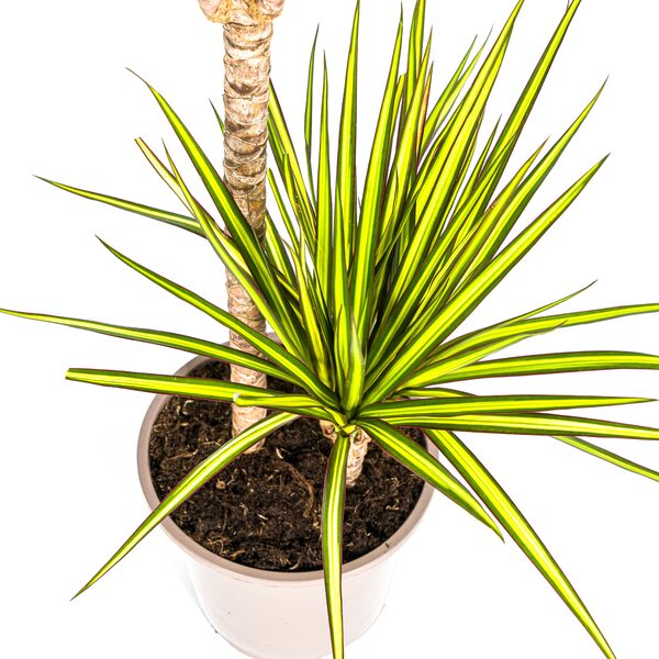 Uiterlijk van de plant: De Dracaena Marginata Sunray heeft lange, smalle bladeren met een levendige mix van groen en gele strepen. Deze bladeren vormen een mooi contrast met de donkere stam van de plant en zorgen voor een tropisch accent in ieder interieur. De bladeren groeien recht omhoog, waardoor de plant een indrukwekkende, maar toch minimalistische uitstraling heeft.