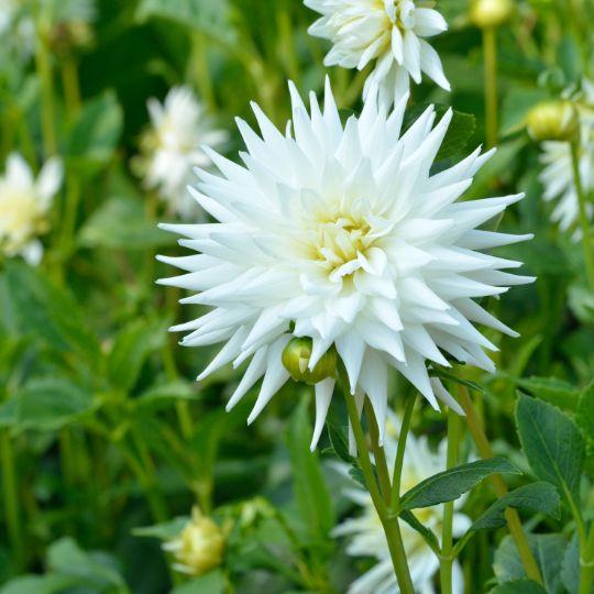 Dahlia ‘Playa Blanca’ schittert in elke tuin met zijn stralende witte bloemen met een subtiel geel hart. Deze heldere, zuivere kleur brengt een frisse uitstraling naar elke buitenruimte en licht donkere hoeken prachtig op. Met zijn grote, cactusvormige bloemen die tot 20 cm in diameter kunnen worden en stevige stelen die ongeveer 60 cm hoog reiken, is ‘Playa Blanca’ ideaal voor zowel tuinbedden als boeketten. Deze dahlia is niet alleen een blikvanger door zijn grootte, maar ook door zijn vermogen om doorlopend nieuwe bloemen te produceren wanneer de oude worden weggesneden. ‘Playa Blanca’ staat bekend om zijn sterke groei en langdurige bloeiperiode, waardoor het een betrouwbare en schitterende aanvulling is op elke tuin van de late lente tot aan de eerste vorst.