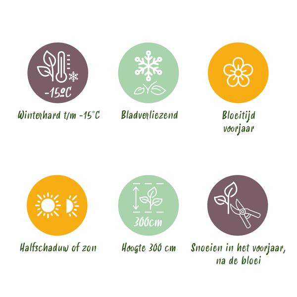 De bloemen van de Cornus mas zijn geel en verschijnen vroeg in het voorjaar, waardoor ze een vrolijke kleuraccent aan uw buitenruimte geven. Het blad is donkergroen en zorgt voor een mooi contrast met de bloeiende takken.