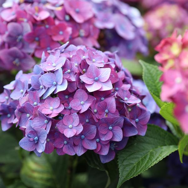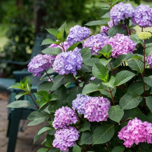 Deze hortensia heeft een compactere groeiwijze, waardoor hij ideaal is voor zowel borders als voor balkon en terras. Met een hoogte van ongeveer 90 tot 120 centimeter en een breedte van 60 tot 90 centimeter, is het een veelzijdige plant die zich aanpast aan verschillende tuinomstandigheden. Het heldere paarse blad heeft een weelderige uitstraling, vooral als het in verbinding staat met de bloemen.