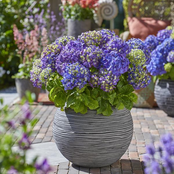 Deze hortensia heeft een compactere groeiwijze, waardoor hij ideaal is voor zowel borders als voor balkon en terras. Met een hoogte van ongeveer 90 tot 120 centimeter en een breedte van 60 tot 90 centimeter, is het een veelzijdige plant die zich aanpast aan verschillende tuinomstandigheden. Het heldere paarse blad heeft een weelderige uitstraling, vooral als het in verbinding staat met de bloemen.