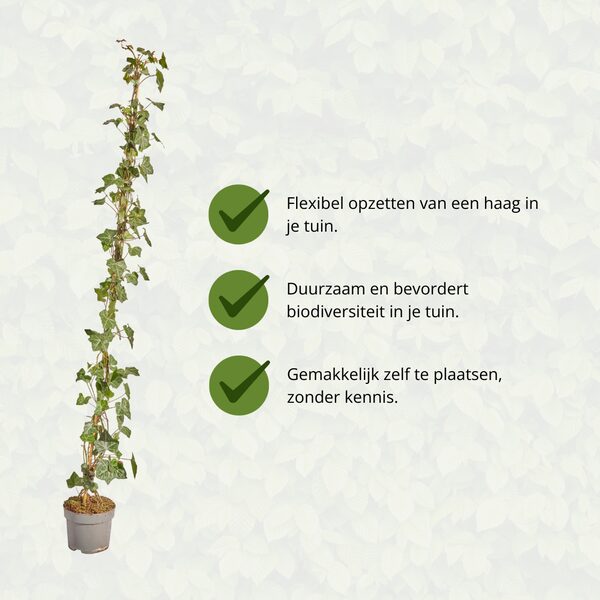 De Hebera Hibernica is bijzonder effectief als haagplant. Zijn dichte groeiwijze zorgt niet alleen voor privacy maar draagt ook bij aan de biodiversiteit in uw tuin door vogels en insecten aan te trekken. Transformeer uw tuin in een levend schilderij met onze Hebera Hibernica Klimop.