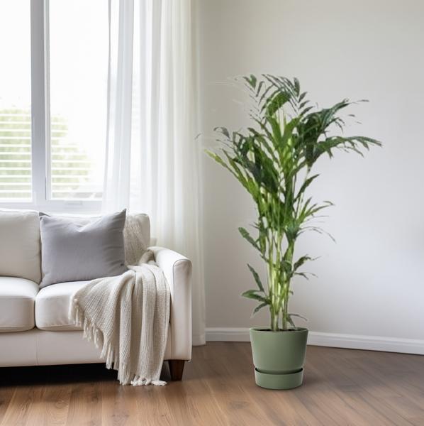 De Kentia Palm staat bekend om zijn slanke stam en veerachtige, boogvormige bladeren, waardoor het een visueel opvallende toevoeging is aan elke binnenruimte. Het is ook een onderhoudsarme plant, die alleen indirect licht en af en toe water nodig heeft. Zijn vermogen om de lucht te zuiveren door giftige stoffen zoals formaldehyde en benzeen te verwijderen, maakt het een geweldige keuze om de binnenluchtkwaliteit te verbeteren. Met zijn oorsprong in het weelderige gebied van Lord Howe Island, brengt de Howea palm een stukje natuurlijke schoonheid in uw huis of kantoor.