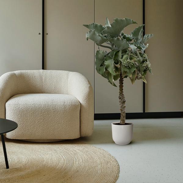 - Uiterlijk van de plant: De Kalanchoë Beharensis stam heeft een indrukwekkende stam met grote, vlezige bladeren die een unieke, grijsgroene kleur hebben. De bladeren zijn ovale en hebben een licht getande rand, wat een interessant textuurcontrast biedt.