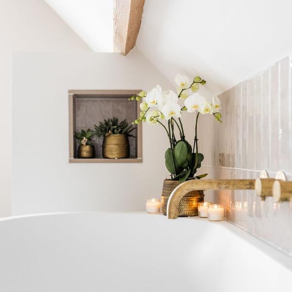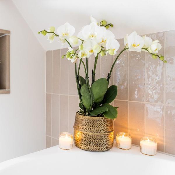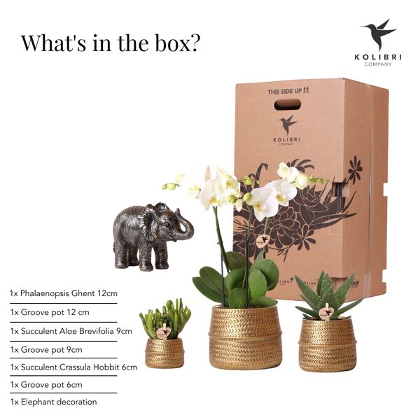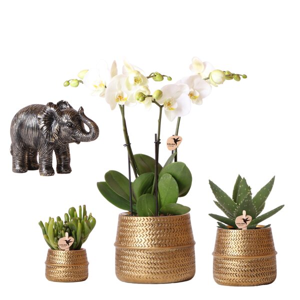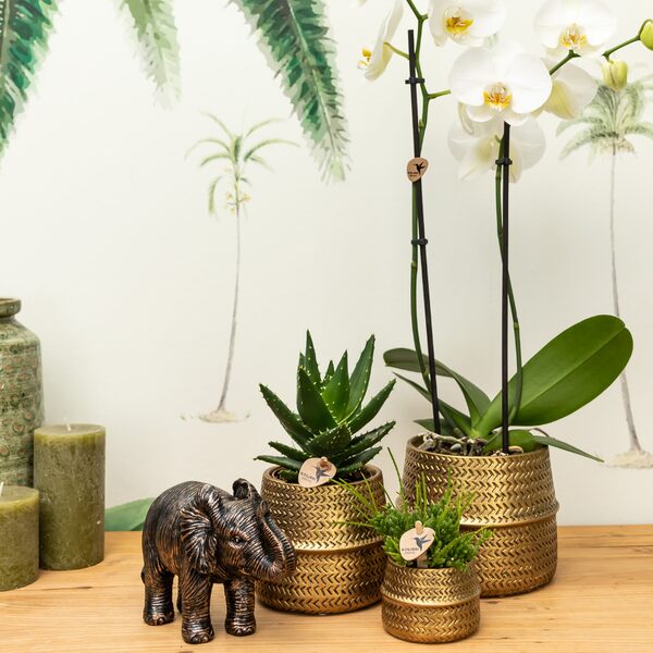 Breng een exotisch tintje in huis met deze stijlvolle set! De set bestaat uit drie luxe Groove sierpotten in goudkleur met een prachtige textuur, in de maten 6, 9 en 12 cm. Elk potje biedt een perfecte basis voor het groen, met in de grootste pot een elegante witte orchidee (Phalaenopsis) van 12 cm. De twee kleinere potten zijn gevuld met stoere succulenten, die zorgen voor een frisse, groene uitstraling.