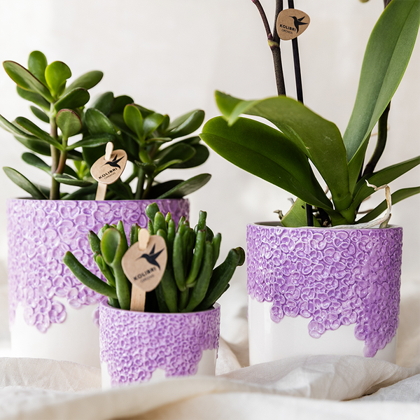 Laat je interieur zacht opbloeien met onze Bloompot in de kleur lila. De lichte paarstint straalt rust, verfijning en een vleugje speelsheid uit. Het elegante bloesemreliëf aan de bovenkant — dat subtiel over de rand lijkt te vloeien — geeft de pot een unieke, luxueuze uitstraling die perfect past in zowel moderne als romantische interieurs.