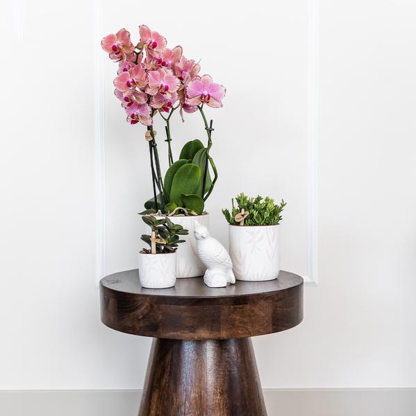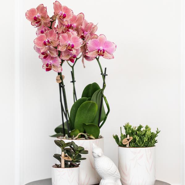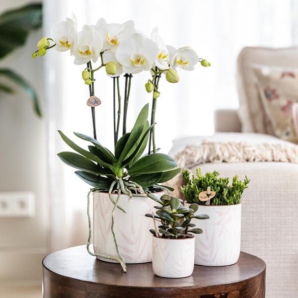 Ontdek de Leaf pot in fris roze, een tijdloze, elegante toevoeging aan je interieur. Perfect voor prachtige orchideeën en groene planten, brengt deze pot een harmonieuze sfeer in huis. De pot heeft een licht glanzende afwerking, waarop de pastelroze bladeren op getekend zijn.