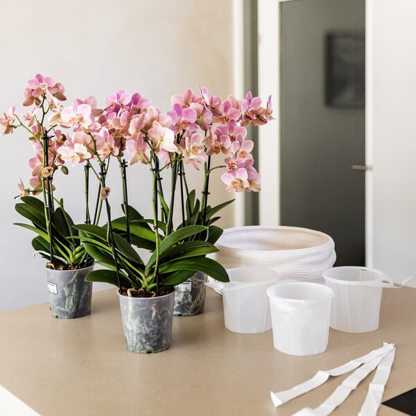 Como sierpot met 2x paarse Morelia orchidee – inclusief Easy Watering System