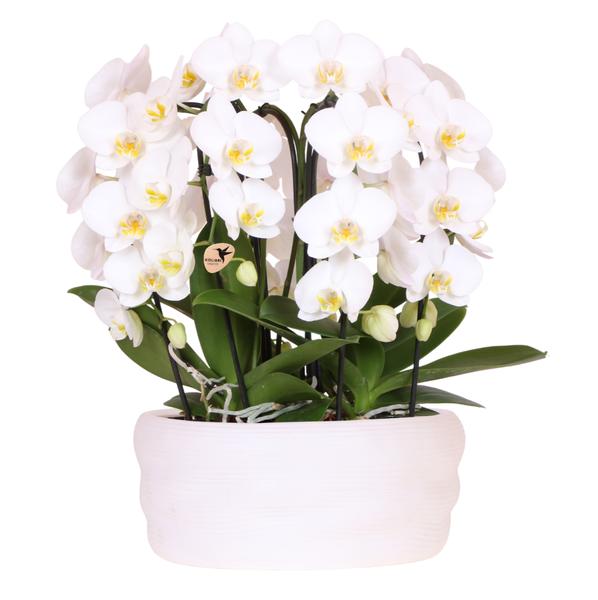 Como sierpot met 3x witte Niagara Falls orchidee – inclusief Easy Watering System