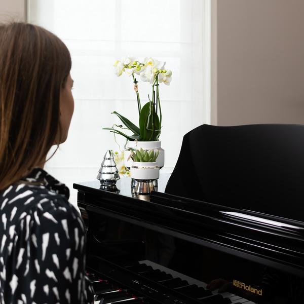 Deze elegante orchidee in combinatie met de Le chic pot zilver zal sfeer en luxe geven aan jouw woonkamer. De orchidee kan je herkennen aan haar sneeuwwitte bloemen en geeft 2 tot 3 stevige takken. De pot is wit en kan je herkennen aan de zilveren details. De pot heeft een gladde afwerking en heeft een potmaat van 9cm. De plant in pot combinatie zal schitteren in jouw interieur.