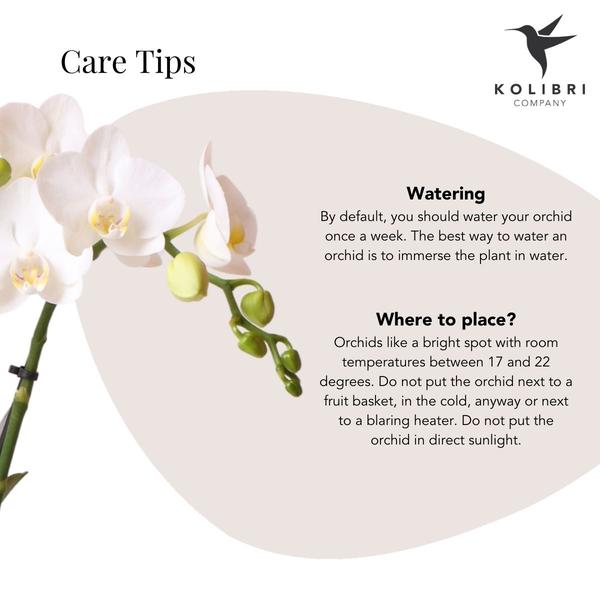 Geef jouw orchidee één keer per week water door de kweekpot onder te dompelen in het water. Laat de orchidee hierna goed uitlekken voordat je de kamerplant terug in de sierpot zet. Kies een lichte plek uit, maar niet in direct zonlicht, met kamertemperaturen tussen 18 en 21 graden. Zet de orchidee daarnaast niet in de buurt van een kachel of verwarming.