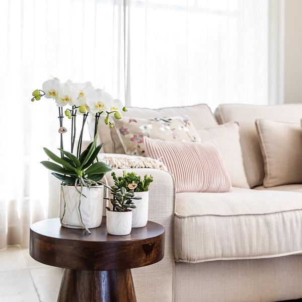 De orchidee wordt geleverd met 2 of 3 stevige takken, afhankelijk van de actuele beschikbaarheid. Omdat we met levende producten werken, kunnen er kleine variaties zijn in het aantal takken of bloemen.