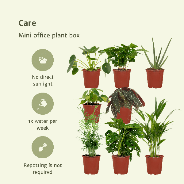 Kamerplanten in een kantoorruimte hebben niet alleen een positief effect op de sfeer op kantoor. De kamerplanten in deze plantenbox dragen ook bij aan een betere luchtkwaliteit. De mini kantoor plantenbox bestaat uit: