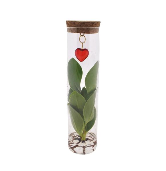 - Een stijlvol glazen buisje met daarin een Clusia plantje – ook wel de ‘luchtzuiverende held’ genoemd.