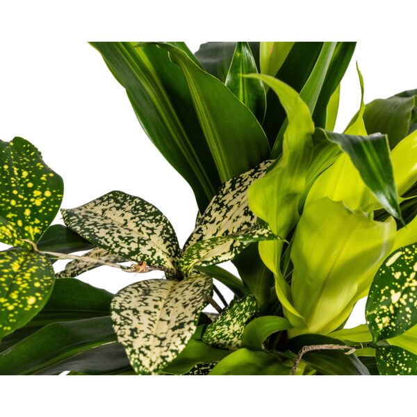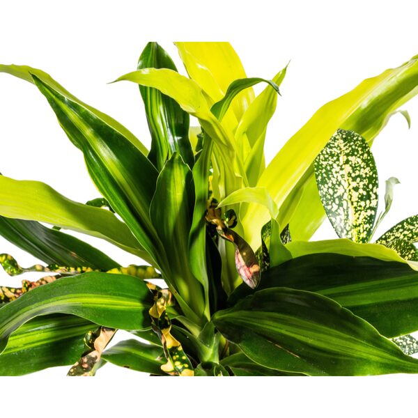Uiterlijk van de plant: De plant bestaat uit een groep van vier robuuste groenplanten die samen in een pot groeien. Ze vormen een harmonieus geheel, waarbij elke plant bijdraagt met zijn eigen, krachtige groene bladeren. Deze combinatie zorgt voor een weelderige en toch onderhoudsarme decoratie die zowel in lichtere als in minder zonnige ruimtes goed gedijt. De planten zijn ideaal voor mensen die een groene oase willen creëren zonder veel moeite.