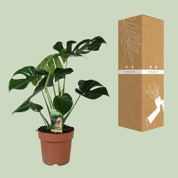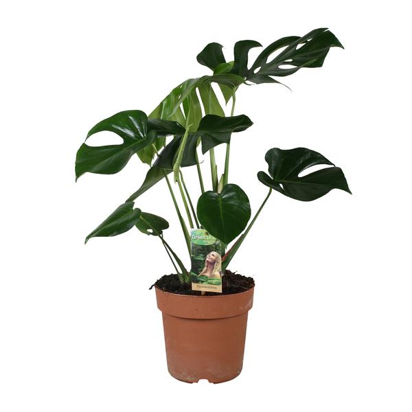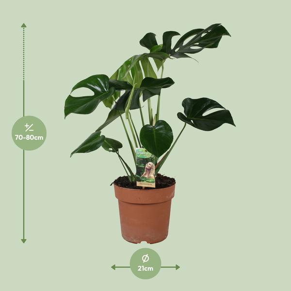 De Monstera, ook bekend als de Gatenplant, is een populaire kamerplant die goed gedijt binnenshuis. Het staat bekend om zijn grote, glanzende bladeren met opvallende gaten en spleten, waardoor het een unieke en tropische uitstraling heeft. Deze kamerplant komt oorspronkelijk uit de regenwouden van Centraal- en Zuid-Amerika, voornamelijk te vinden in gebieden zoals Mexico, Panama en Colombia. Het warme en vochtige klimaat van deze regio’s biedt optimale omstandigheden voor de Monstera om te groeien en te bloeien.In zijn natuurlijke habitat wordt de Monstera vaak gevonden terwijl deze langs bomen omhoog klimt en zichzelf met zijn luchtwortels vasthecht. Deze plant heeft zich aangepast aan de lagere lichtniveaus in de dichte regenwouden, waardoor hij goed geschikt is voor binnenomgevingen met indirect zonlicht. Hoewel het lagere lichtomstandigheden kan verdragen, heeft het wel wat blootstelling aan zonlicht nodig om zijn kenmerkende spleten in de bladeren te ontwikkelen.Over het algemeen is de Monstera een aantrekkelijke en onderhoudsvriendelijke kamerplant die een vleugje tropische sfeer toevoegt aan elke ruimte. Met zijn oorsprong in de weelderige regenwouden van Centraal- en Zuid-Amerika brengt het een vleugje exotische schoonheid in het comfort van uw huis. De Monstera plant gedijt goed op een plek met halfschaduw of schaduw, waardoor het perfect is voor binnenruimtes met beperkt zonlicht. Het moet eens per week water krijgen om de grond vochtig te houden, maar niet doorweekt. Monstera geeft de voorkeur aan goed doorlatende grond, zoals een mix van veenmos, perliet en potgrond. Bemest de plant eens per maand tijdens het groeiseizoen, gebruikmakend van een gebalanceerde, oplosbare meststof om het van de nodige voedingsstoffen te voorzien. Onthoud dat te veel direct zonlicht de bladeren kan verbranden, dus het vinden van de juiste balans is essentieel voor het verzorgen van je Monstera.Monstera is een populaire keuze voor kamerplanten vanwege zijn grote, leerachtige en uniek gevormde bladeren. Het levendige groene blad voegt een tropisch tintje toe aan elke ruimte, terwijl de plant ook geschikt is voor omgevingen met weinig licht. Monstera wordt vaak gebruikt als opvallend middelpunt of natuurlijke scheiding in huizen, kantoren en andere interieurinstellingen.Deze Monstera plant wordt geleverd in een 21 cm pot, perfect voor eenvoudige behandeling en verzorging.Met een huidige hoogte van ongeveer 80 cm is deze Monstera al een prachtige toevoeging aan elke ruimte.Geplaatst op een plek die halfschaduw ontvangt, gedijt deze plant en laat hij zijn levendige bladeren zien.De verzorging van een Monstera is uiterst eenvoudig, waardoor het een ideale keuze is voor zowel beginners als ervaren plantenliefhebbers.Het unieke en onderscheidende kenmerk van de Monstera zijn zijn grote, ingesneden bladeren, die een vleugje tropische schoonheid toevoegen aan elk interieur.
