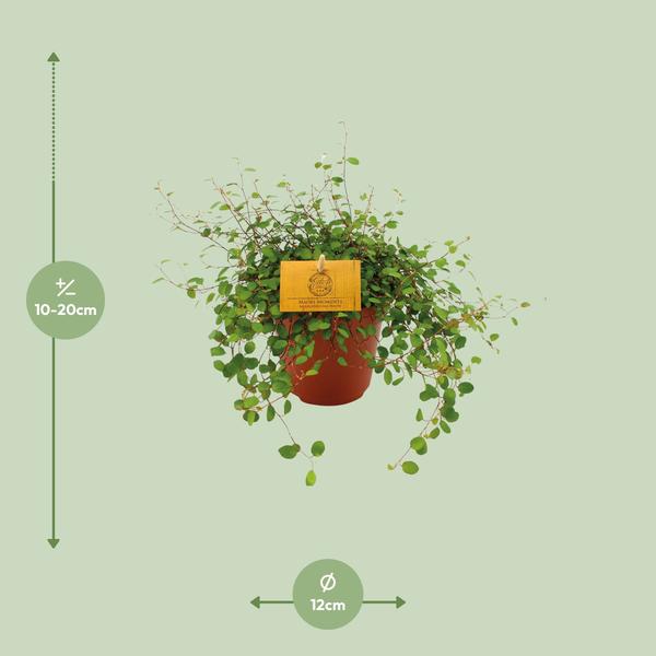 – De Kettingplant, die bekend staat om zijn elegante hangende takken, wordt geleverd in een compact formaat van 12 cm.- Met een huidige hoogte van ongeveer 20 cm belooft deze Kettingplant schoonheid en frisheid toe te voegen aan elke binnenruimte.- Deze plant gedijt het beste op een plek met halfschaduw, waardoor het perfect is voor degenen die een rustgevende en vredige sfeer willen creëren.- De verzorging van de Kettingplant is een fluitje van een cent, waardoor het een ideale keuze is voor zowel ervaren plantenliefhebbers als beginners.- Met zijn delicate hartvormige bladeren zal deze prachtige plant moeiteloos de esthetische aantrekkingskracht van elke kamer versterken.