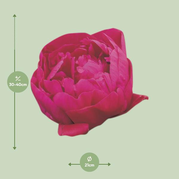 Deze robuuste Pioen staat trots op een huidige hoogte van ongeveer 35 cm, waardoor het een opvallende toevoeging is aan elke ruimte.