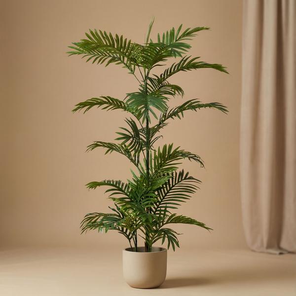 De Palm Phoenix kunstplant van 120 cm brengt tropische sfeer in huis of op kantoor zonder dat je er omkijken naar hebt. Dankzij de natuurgetrouwe palmbladeren en het realistische design lijkt deze kunstpalm bijna niet van een echte palm te onderscheiden, wat hem ideaal maakt voor interieurdecoratie met kunstplanten. Omdat hij volledig onderhoudsvrij is en geen water, licht of verzorging nodig heeft, is deze nepplant een duurzame en stijlvolle keuze voor elke ruimte.