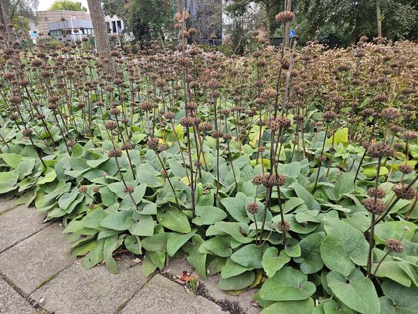 **Phlomis russeliana** is een opvallende, winterharde vaste plant met unieke lichtgele bloemen in kransen langs de stengel, bloeiend van de vroege zomer tot in de herfst. Deze plant vormt grote, groene bladeren die ook in de winter structuur geven. Ideaal voor borders en natuurlijke tuinen, en aantrekkelijk voor bijen en vlinders. **Phlomis russeliana** is onderhoudsarm, droogtetolerant, en zorgt voor langdurige kleur en interesse in de tuin.