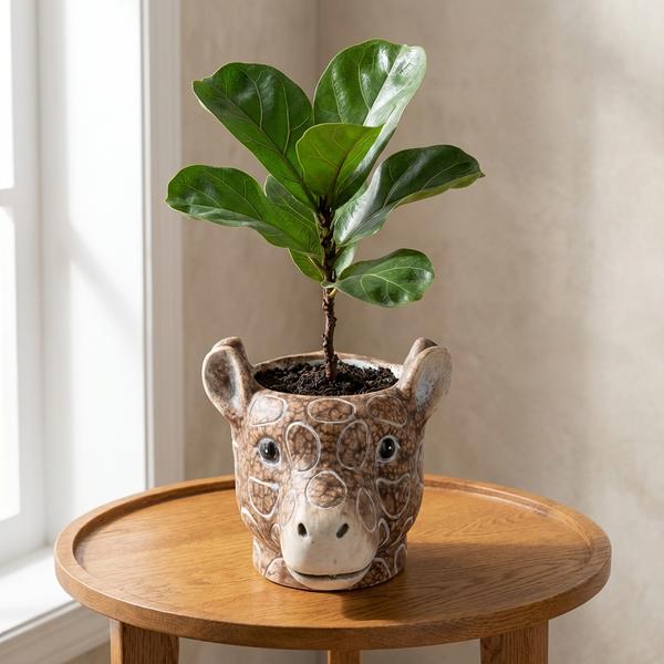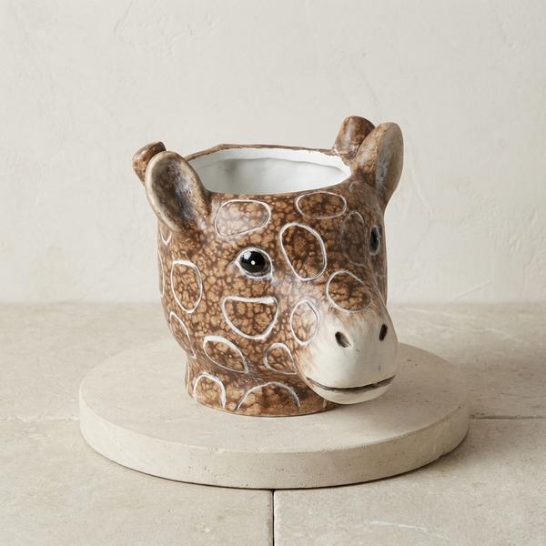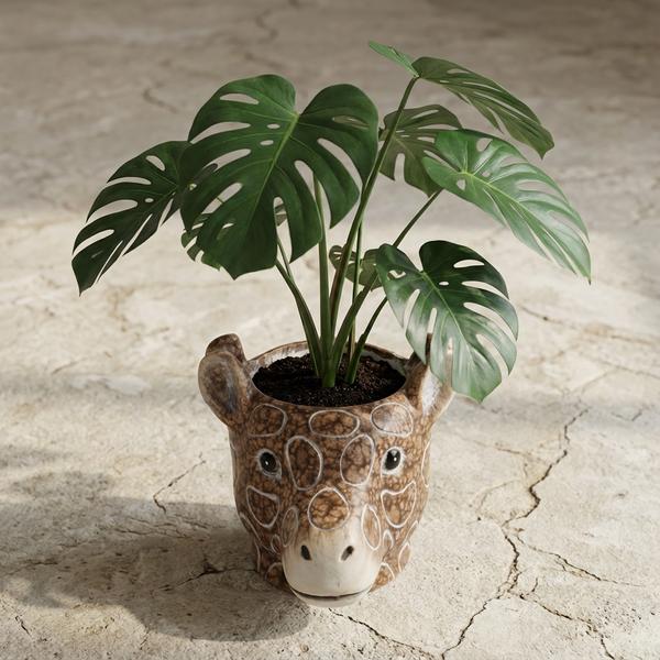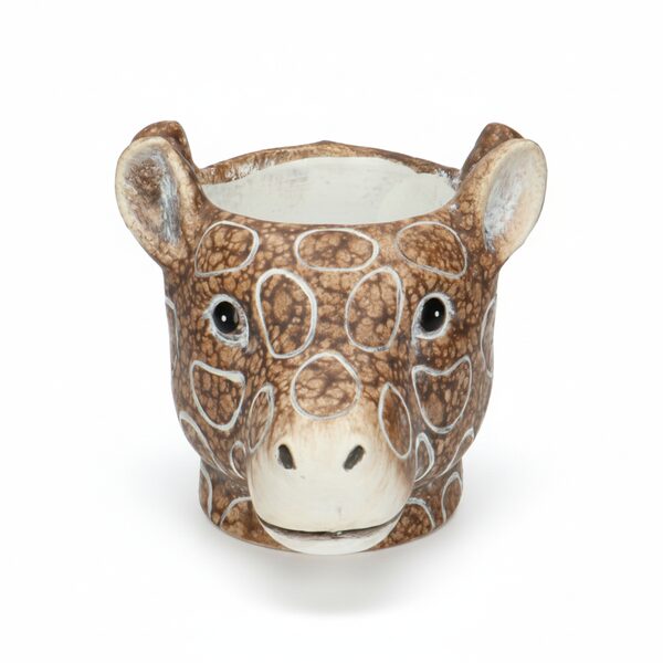 Stel je voor hoe deze charmante giraffenplanter jouw ruimte opvrolijkt, een ware blikvanger die bij iedereen een glimlach tovert! Met liefde voor detail vervaardigd, vangen de warme bruintinten en het unieke stippenpatroon perfect de zachte geest van de savanne. Deze schattige metgezel biedt een gezellig thuis voor jouw favoriete kleine plantje of vetplant, en geeft elke kamer direct een speelse, exotische warmte en natuurlijke elegantie. Het is veel meer dan een pot; het is een stukje vrolijkheid.