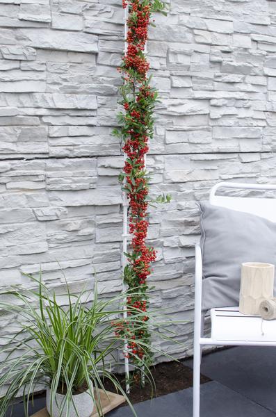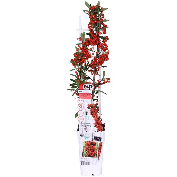 Deze Vuurdoorn Red Star heeft minder doornen dan andere Pyracantha en is wintergroen met rode bessen die september rood kleuren.