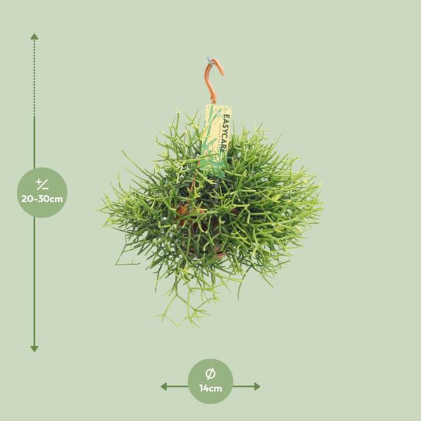 Deze Rhipsalis wordt geleverd in een pot van 14 cm, perfect voor binnenruimtes.De huidige hoogte van deze Rhipsalis is ongeveer 25 cm, waardoor hij naadloos past in elke kamer.Zoek de perfecte plek voor deze plant – hij gedijt goed in halfschaduwgebieden, waardoor hij ideaal is voor kamers met beperkt natuurlijk licht.Het verzorgen van Rhipsalis is eenvoudig, omdat het minimale onderhoud vereist en zeer aanpasbaar is.Met zijn unieke hangende en overhangende stelen voegt Rhipsalis een vleugje elegantie en natuurlijke schoonheid toe aan elke ruimte.