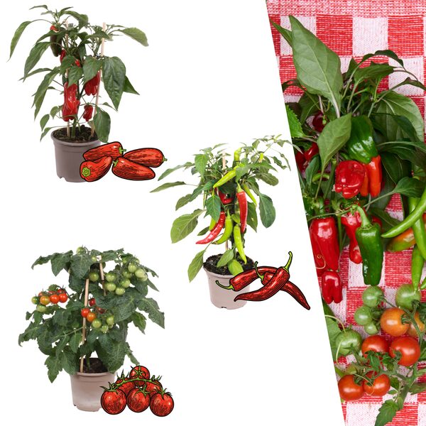 Beleef de veelzijdigheid van het zelf kweken met onze Rode Plukgroente Mix! Deze set bestaat uit drie verschillende planten: Cherry Tomaat, Rode Snack Paprika en Rode Hete Peper. Allemaal compact, productief en perfect voor directe consumptie. De ideale mix voor iedereen die van frisse, smakelijke en veelzijdige groenten houdt, en dat zelfs met beperkte ruimte! Elke plant wordt geleverd in een pot van 14 cm en heeft bij levering een hoogte van 45 cm.