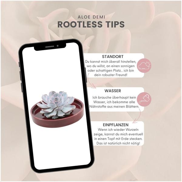 ROOTLESS succulents worden geteeld in een kweekpot en groeien tot het juiste formaat. Als het rozet van de plant groot genoeg is, dan wordt deze losgesneden van de potgrond. Een ROOTLESS kan een Echeveria, Aloe en Gasteria zijn. Andere namen voor ROOTLESS zijn snijvetplant, snijplant, snij-echeveria en snijsucculent.