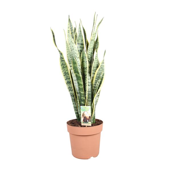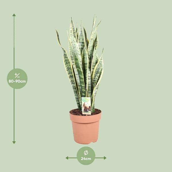 Maak kennis met onze prachtige kamerplant, de Sansevieria trifasciata Laurentii, ook wel bekend als de schoonmoedersplant. Deze plant komt oorspronkelijk uit tropisch West-Afrika en gedijt uitstekend in omgevingen met weinig licht, waardoor hij perfect is voor elke binnenruimte. De lange, zwaardvormige bladeren hebben levendige groene kleuren en zijn omlijst door opvallende gouden randen, waardoor ze elke kamer moeiteloos verlichten. Deze robuuste, onderhoudsvriendelijke plant zuivert niet alleen de lucht, maar voegt ook een vleugje elegantie toe aan uw leefomgeving. Haal de schoonheid in huis en verfraai uw ambiance met de tijdloze charme van de Sansevieria trifasciata Laurentii. Ervaar de sereniteit van de natuur in het comfort van uw eigen huis. Maak kennis met de prachtige Sansevieria trifasciata Laurentii – de perfecte toevoeging aan jouw binnen- of buitenruimte! Deze sterke plant gedijt in een plek waar het gedeeltelijke schaduw of zelfs halfzonlicht kan krijgen. Met zijn opvallende geel omrande bladeren voegt het een oogverblindend element toe aan elk interieur. Houd deze schoonheid blij met regelmatig water geven, idealiter elke 8-10 dagen. Zijn veerkracht en veelzijdigheid maken het een uitstekende keuze voor zowel beginners als ervaren plantenliefhebbers. Verhoog je groenarsenaal met Sansevieria trifasciata Laurentii – een onderhoudsvriendelijke, indrukwekkende plant die leven brengt in elke omgeving. Bestel vandaag nog de jouwe en kijk hoe het gedijt!Wist je dat Sansevieria trifasciata Laurentii, ook wel bekend als de slangenplant, niet alleen een prachtige decoratieve plant is, maar ook een natuurlijke luchtzuiveraar? Zijn unieke vermogen om koolstofdioxide ‘s nachts om te zetten in zuurstof maakt het een uitstekende keuze voor slaapkamerdecoratie. Echter, terwijl deze plant een vleugje elegantie toevoegt aan je ruimte, is het belangrijk om te onthouden dat het alleen bedoeld is voor decoratie. Laten we dus genieten van zijn levendige geel omrande bladeren, maar in gedachten houden dat deze schoonheid niet bedoeld is voor consumptie.- Sansevieria trifasciata Laurentii heeft een potmaat van 24 cm, waardoor het ideaal is voor binnen- of terrasweergave.- Deze plant is ongeveer 90 cm hoog en voegt een verticaal element toe aan elke ruimte.- Sansevieria trifasciata staat algemeen bekend als schoonmoederstong, vanwege de scherpe, puntige vorm van zijn bladeren.- Deze plant gedijt op een plek met gedeeltelijke schaduw en is daardoor aanpasbaar aan verschillende lichtomstandigheden binnenshuis.- Leuk weetje: Sansevieria heeft luchtzuiverende eigenschappen en kan helpen de binnenluchtkwaliteit te verbeteren door giftige stoffen te filteren.