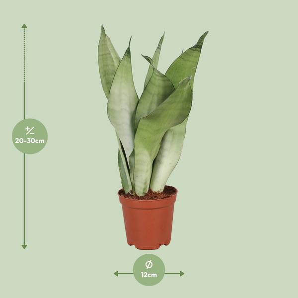 Maak kennis met de prachtige Sansevieria trifasciata Moonshine, een verbluffende kamerplant met een vleugje eigentijdse elegantie. Ook bekend als Vrouwentong, is deze oogverblindende schoonheid afkomstig uit droge gebieden in West-Afrika. Haar unieke zilvergroene bladeren stralen ingetogen charme uit en maken het een perfecte toevoeging aan elk huisinterieur. Met gemak in onderhoud gedijt deze plant uitstekend in omgevingen met weinig licht en heeft slechts minimaal water nodig. Omarm de schoonheid en verfijning van Moonshine, een kamerplant die de gratie van de natuur moeiteloos naar jouw leefruimte brengt. Verrijk vandaag nog je interieur met deze prachtige en veelzijdige kamerplant! Maak kennis met de Sansevieria Trifasciata Moonshine, een prachtige toevoeging aan uw binnen- of buitenruimte! Deze gemakkelijk te verzorgen plant gedijt in halfschaduw of gedeeltelijk zonlicht, waardoor het geschikt is voor verschillende omgevingen. Met zijn strakke zilvergroene bladeren zal het zeker uw interieur verfraaien. Het heeft minimale waterbehoefte en hoeft slechts eens in de 8-10 dagen water te krijgen. Het verzorgen van deze schoonheid is een fluitje van een cent, zelfs voor mensen met een druk leven. Haal vandaag nog de Sansevieria Trifasciata Moonshine in huis en geniet van zijn schoonheid en eenvoudige onderhoud. Verhoog moeiteloos uw ruimte!Wist je dat Sansevieria trifasciata Moonshine, algemeen bekend als de Moonshine Snake Plant, niet alleen een prachtige toevoeging is aan elke binnenruimte, maar ook luchtzuiverende eigenschappen heeft? Met zijn kenmerkende zilvergroene bladeren brengt het een vleugje elegantie in je huis of kantoor, terwijl het efficiënt de lucht zuivert door giftige stoffen te verwijderen! Houd er echter rekening mee dat deze prachtige plant alleen bedoeld is voor decoratieve doeleinden, waardoor het een fantastische niet-eetbare optie is voor plantenliefhebbers die hun ruimtes willen verfraaien met een onderhoudsarme en visueel aantrekkelijke groene metgezel.- Sansevieria trifasciata Moonshine heeft een potmaat van 12 cm, waardoor het geschikt is voor kleine ruimtes en binnentuinieren.- Deze plant groeit meestal tot ongeveer 30 cm hoogte, waardoor het een compacte keuze is voor elke kamer of kantooromgeving.- Sansevieria trifasciata, ook bekend als Vrouwentong, is een populaire kamerplant die bekend staat om zijn lange, zwaardvormige bladeren met een opvallend gevlekt patroon.- Deze plant gedijt op een plek met gedeeltelijke schaduw, waardoor het ideaal is voor locaties met indirect zonlicht of gebieden die gedurende de dag gefilterd licht ontvangen.- Een leuk feitje over Sansevieria is dat het een van de beste luchtzuiverende planten is en helpt bij het verwijderen van giftige stoffen uit de binnenlucht, waardoor de algehele luchtkwaliteit in uw huis of kantoorruimte verbetert.