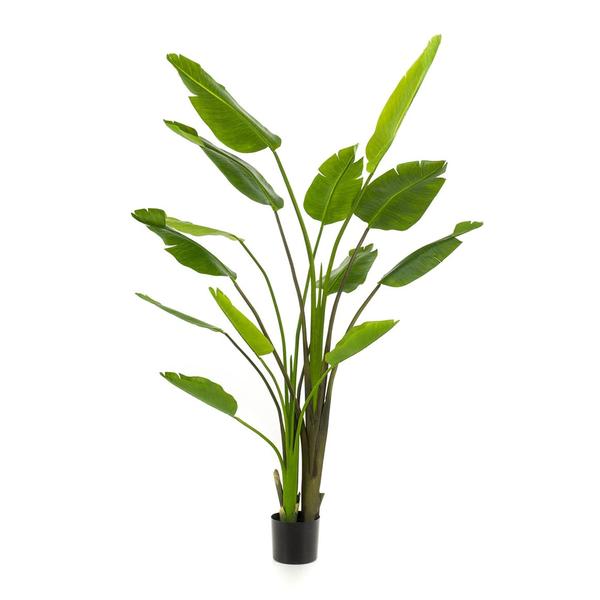 Groot, groen en groots in uitstraling. De Strelitzia Nicolai kunstplant van 180 cm is een statement piece voor elk interieur. De brede, bananenbladachtige bladeren zorgen voor een tropische sfeer zonder dat je ooit naar de gieter hoeft te grijpen. En met z’n strakke zwarte pot staat deze plant letterlijk én figuurlijk als een huis.