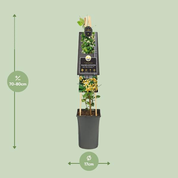 Momenteel heeft het een sierlijke hoogte van 75 cm en staat deze Sterjasmijn klaar om een ​​aanzienlijke impact te hebben in uw tuin of op uw terras.
