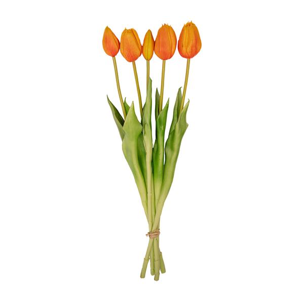 Breng de frisse uitstraling van de lente in huis met dit Tulpen Boeket Oranje! Dit boeket bestaat uit 5 prachtige kunsttulpen in een levendige oranje kleur, met een realistische ‘Real Touch’ afwerking van 42 cm. De tulpen voelen bijna aan als echte bloemen en hebben een natuurlijke uitstraling, waardoor ze een vrolijke en frisse sfeer aan je interieur toevoegen. Perfect voor een vaas op je tafel, dressoir of vensterbank, of als decoratie voor speciale gelegenheden. Geniet het hele jaar door van deze bloemen zonder dat je je zorgen hoeft te maken over water geven of verwelking!